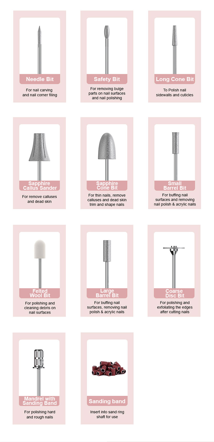 4:Rechargeable and Cordless: The cordless nail drill is equipped with battery powered, providing great portability and more than 6 Hours on a full charge cordless operation. And if you need more time, you can even use it while it's charging