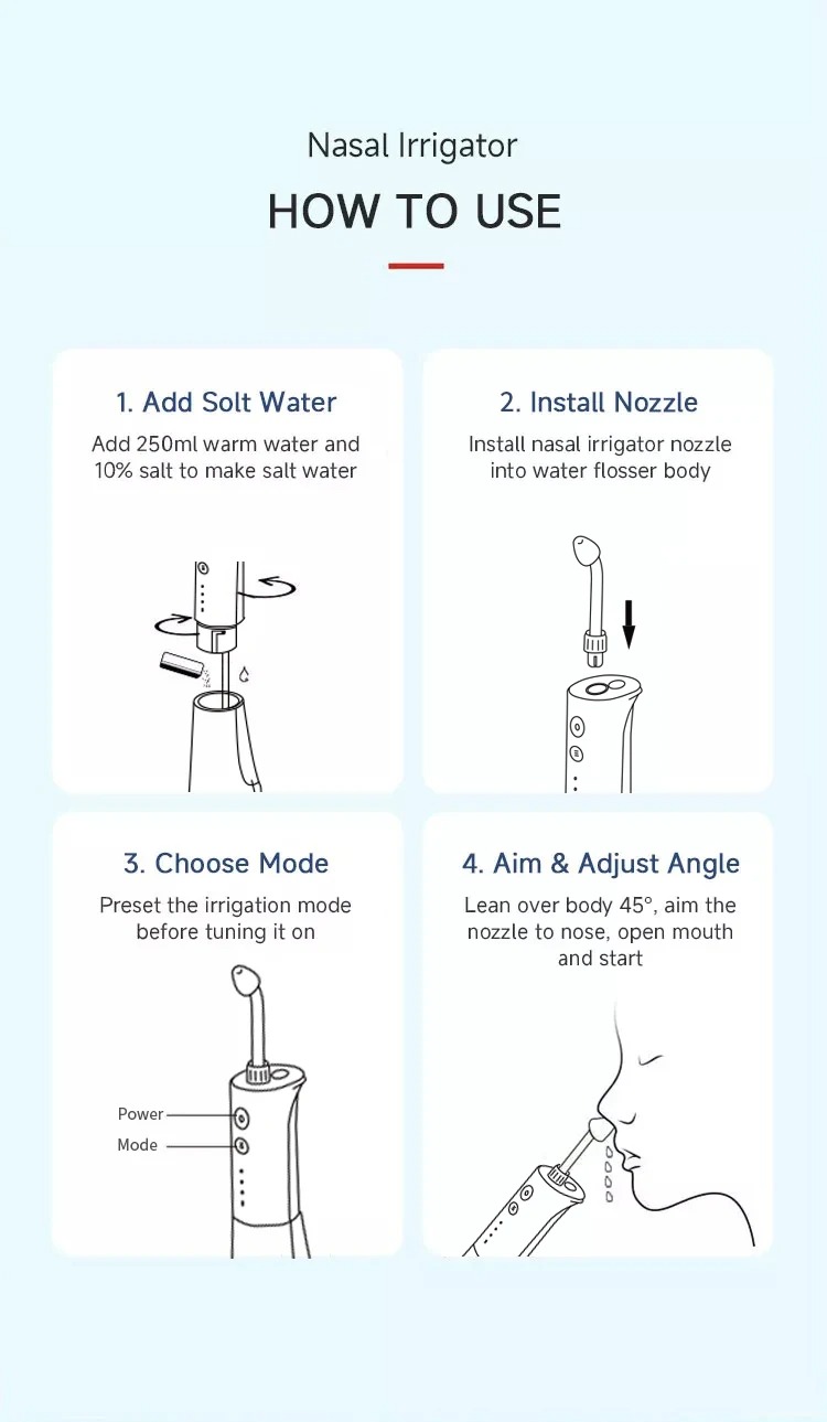 Рад са напајањем: За разлику од традиционалних ручних иригатора за нос, електрични назални иригатори се напајају електричном енергијом, обично користећи пуњиве батерије или АЦ адаптер.