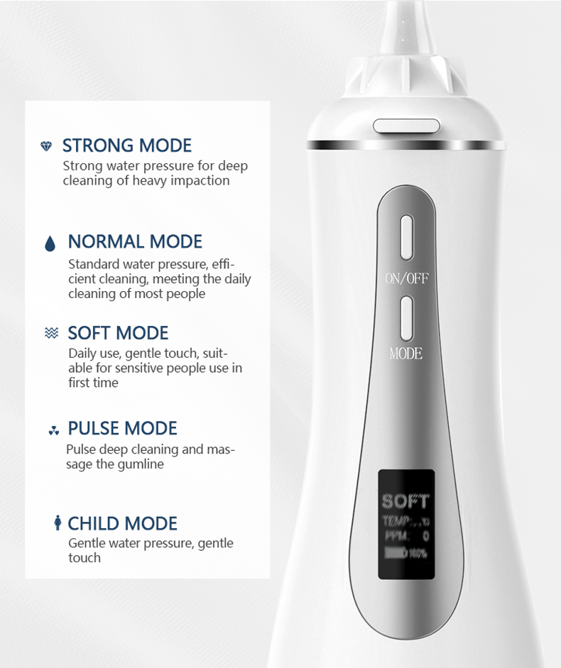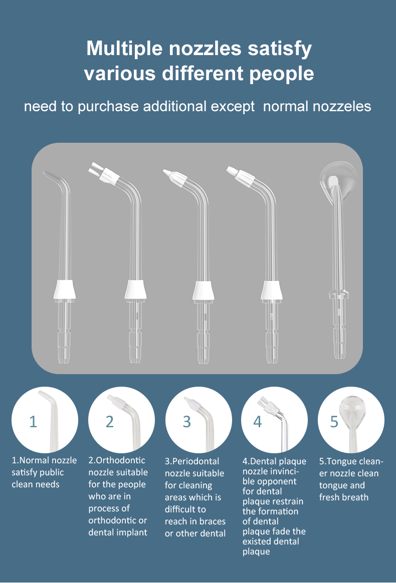 Професионално оцењен од стране америчког стоматолошког тима, наш конац пружа пет практичних режима који одговарају различитим потребама 99% различитих старосних група, истовремено осигуравајући оптималне перформансе и животни век. Његова ергономска ручка и 6 заменљивих млазница обезбеђују удобно и разноврсно искуство. То је промишљен поклон за рођендане, Божић, Дан захвалности, Дан заљубљених, Дан оца или бригу о оралном здрављу ваших најмилијих