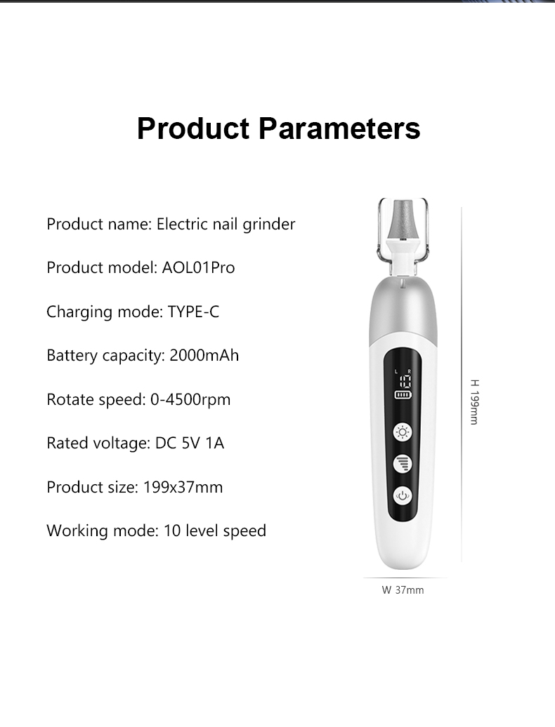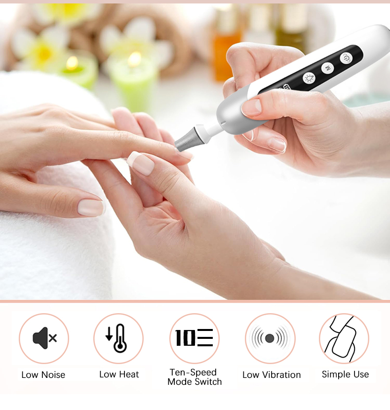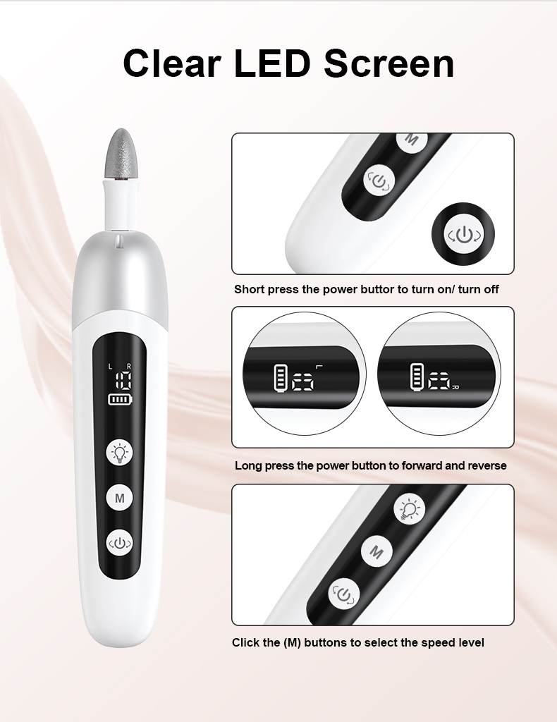 - ИНОВАТИВНИ ЛЕД ЕКРАН: Лако се крећете по жељеним подешавањима. ЛЕД екран показује статус батерије, жељену брзину и подешавања ротације за рад без напора. Електрична машина за нокте је такође опремљена интегрисаним ЛЕД светлом које осветљава делове на рукама и стопалима