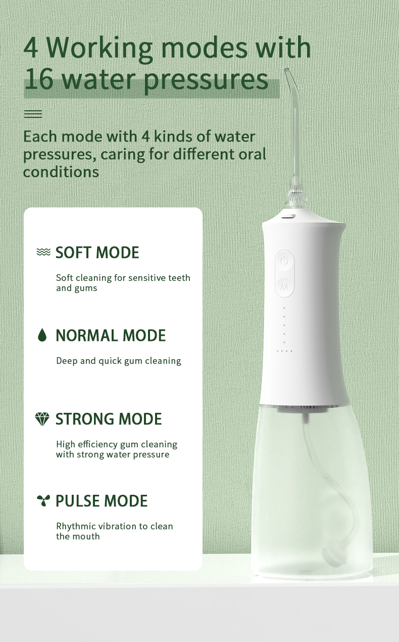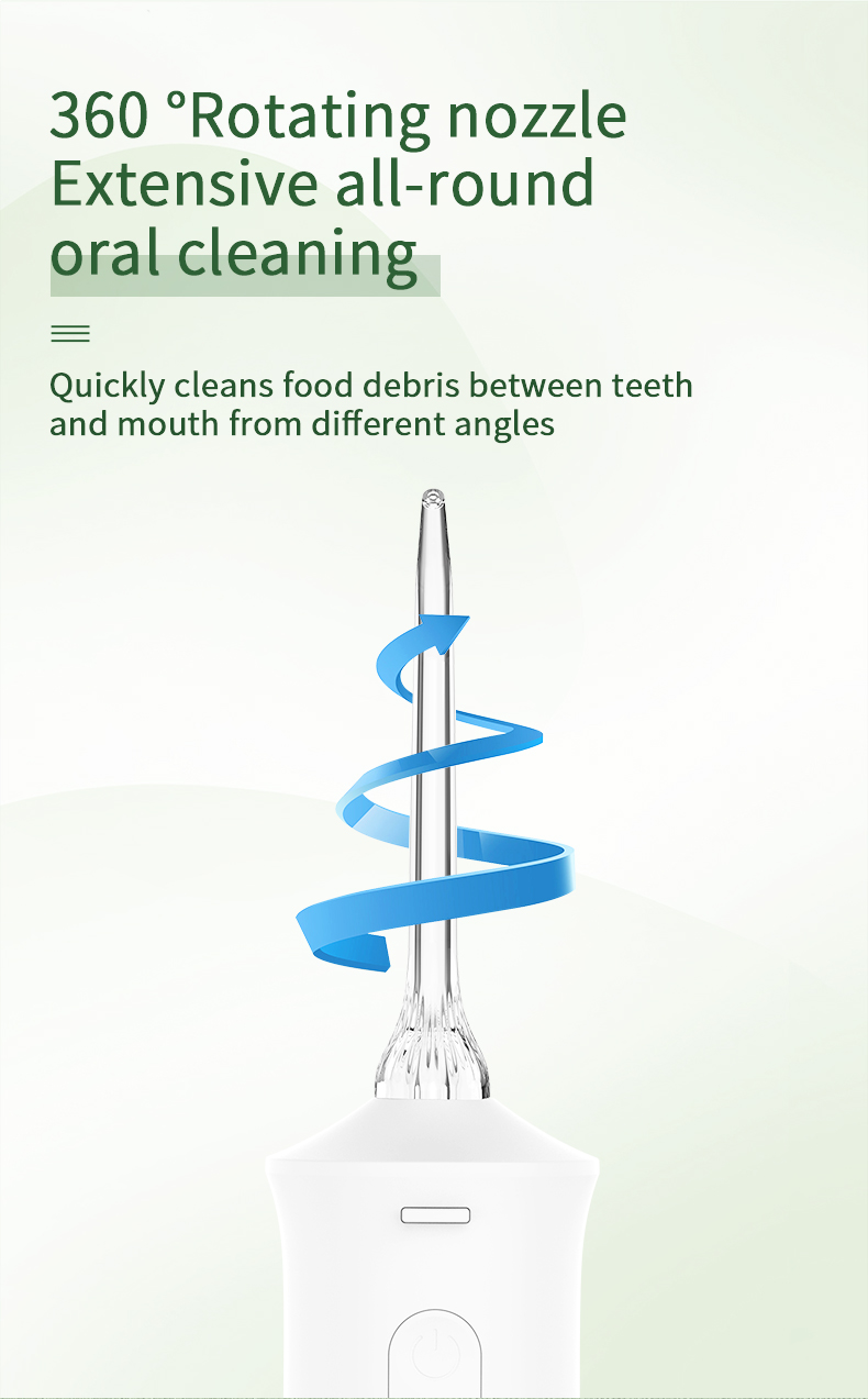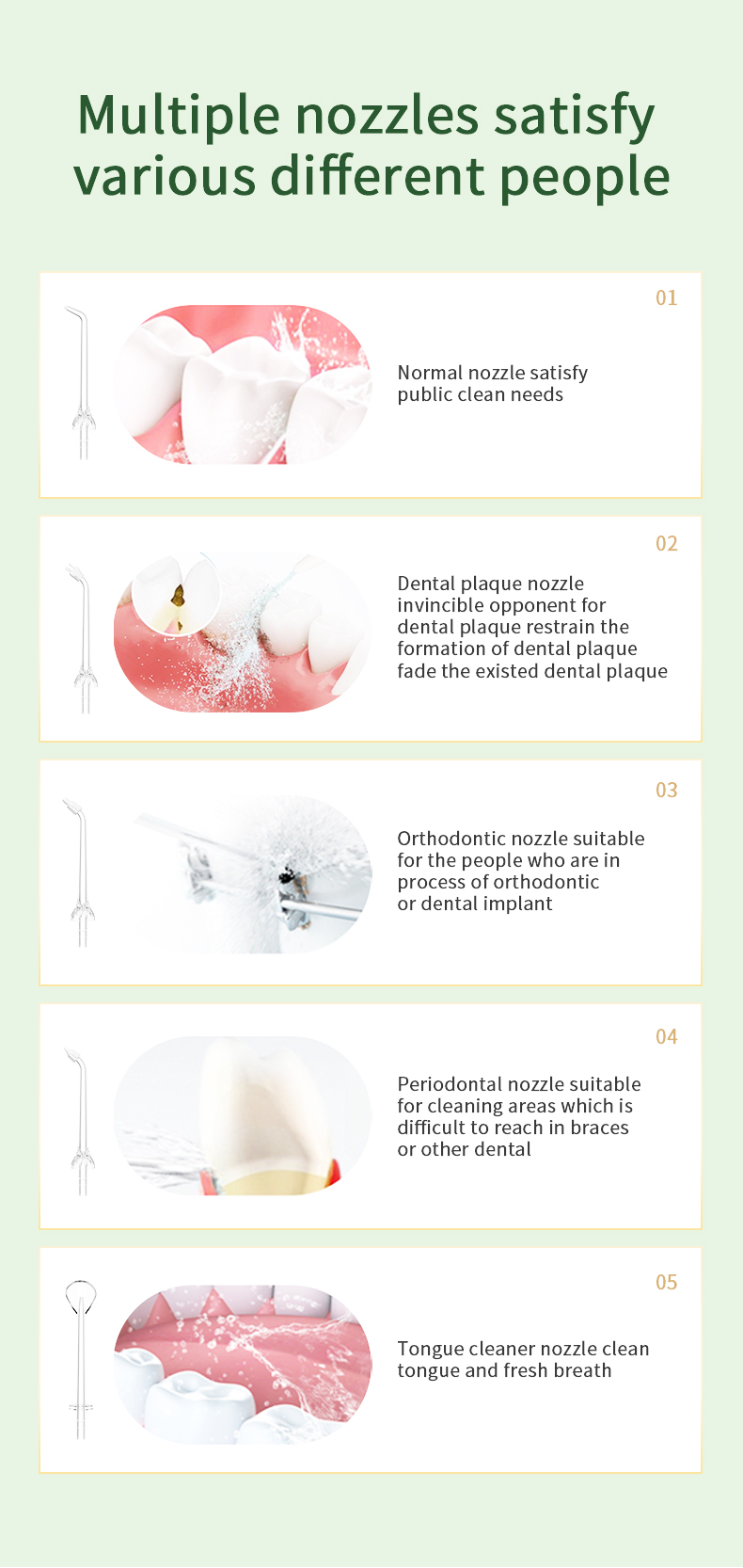 Овај зубни пилинг за воду даје импулсе високог притиска воде 1400-1800 пута у минути, ефикасно уклањајући 99,9% зубног наслага за дубинско чишћење зуба. Овај водени зубни пилинг масира десни, подстиче циркулацију крви и решава оралне проблеме као што су лош задах, ортодонтски зуби